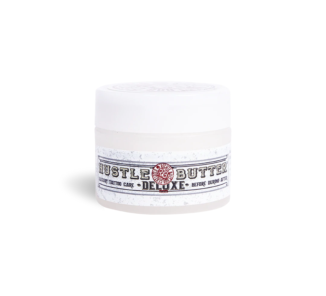 Hustle Butter Deluxe Luxury Tattoo Aftercare & Daily Moisturizing Tattoo Cream is as luxurious and rich as it sounds. Developed as an all natural, petroleum replacement lubricant used in the tattoo healing process, it is the #1 rated tattoo aftercare product amongst artists and clients with amazing value when tending to swelling & skin inflammation.